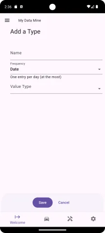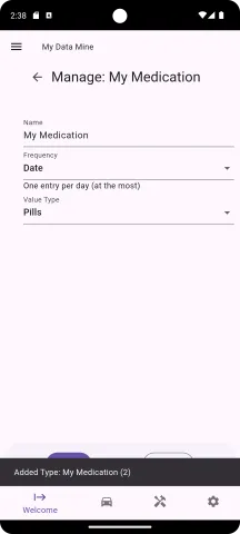 Press the back arrow button near the top of the screen to return to the "Manage your Data Mine Types" screen. You will see your new data type in the listing, which in our example, is "My Medication". More importantly, you will see the new type (e.g. My Medication) on the Welcome screen where you can start collecting data.